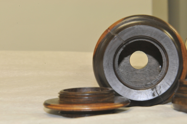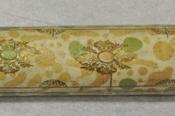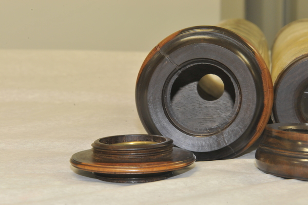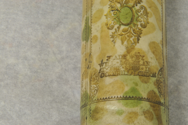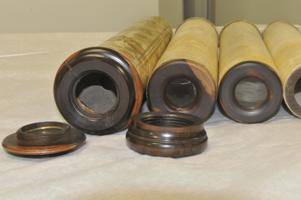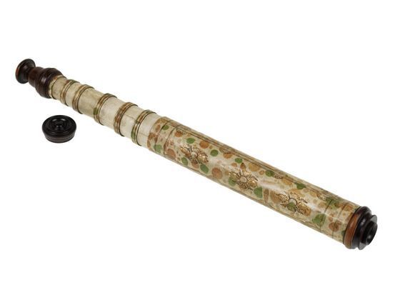 "The barrel and six draw tubes of this non-achromatic telescope are made of vellum with fittings of lignum vitae, including a screw-on cap for the objective lens. The barrel is also decorated with gold-tooled motifs and has the maker's name stamped on it: 'MADE BY WILL LONGLAND AT THE SHIP IN CORNHILL LONDON'. Early telescope lenses suffered from the appearance of coloured fringes, a problem that could be reduced by using lenses with long focal lengths. This meant, however, that the telescopes had to be very long - this telescope can be extended to over 1.5m. To make them compact and light enough to carry, they were made of several draw tubes, which were typically of papier-mâché covered in vellum. This example has a black line on each draw tube to indicate its optimum working length" (Royal Museums Greenwich).