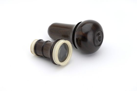 "This is a spyglass or miniature telescope. It is very well made, but was meant as a fashionable personal accessory that could fit in one's pocket rather than as a serious telescope. The barrel is made of turned lignum vitae and the lenses are set in ivory mounts. It has a turned wooden case (also lignum vitae) that has been made to fit the telescope exactly" (Royal Museums Greenwich).