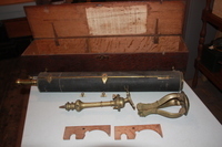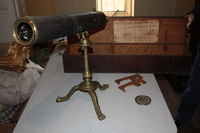 Stuck inside the wooden case is a description of ‘A Gregorian reflecting telescope as made and sold by John Cuff’. The telescope itself is metal and is approximately 30 inches long and 3 ½ inches in diameter. We can see no signature on it (except the piece of paper stuck to the lid of the case). [National Trust website lists this as by John Ayt. Mistake?]