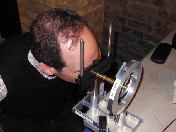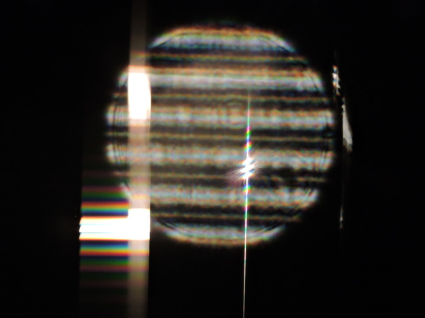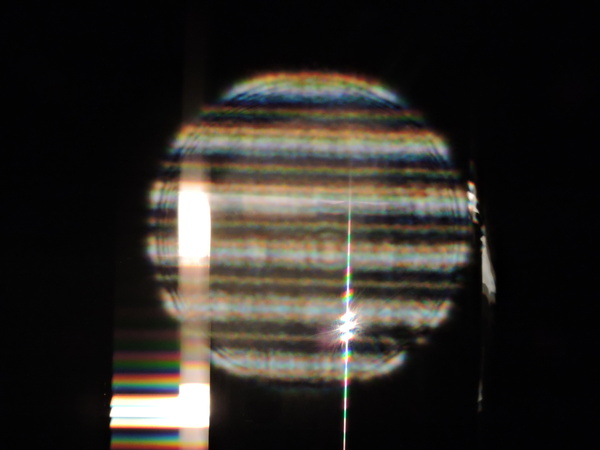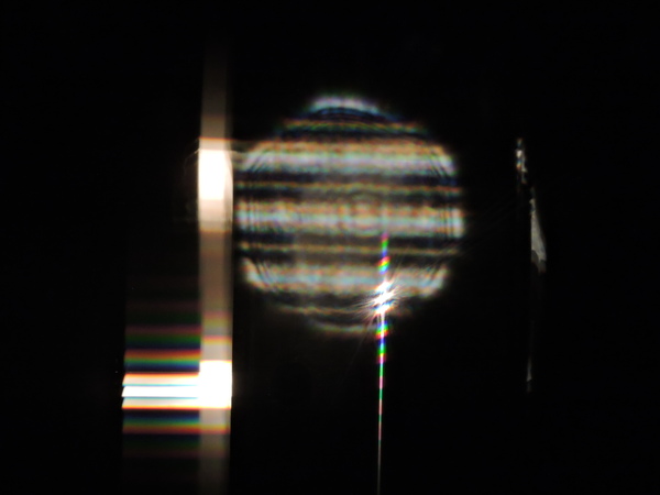 Focal length measured first directly with card in large collimated beam. Gasket off-center. Grozed. Gives triple image (one dominant).