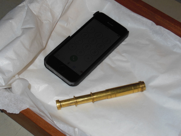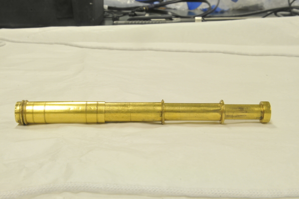 Pasteboard etui 88.5 long, diam 25.0. Brass container with crown 83.7, diam 18.2. With the crown the collapsed telescope fits well into the leather etui; without it, not. Starside end of Draws 1, 2, and 3 has brass washer; the inner diameter of each draw is larger than the opening of its washer. Optical length determined for target at 142 paces (MK). Two extension marks on each draw: (1) 5.5, 28.6; (2) 6.7, 23.5; (3) 5.4, 30.0. This leads to total optical lengths of 180 mm (no image visible at this length) for the leftmost extension marks and 119.5 - 121.7 mm for the rightmost marks. When focused at distant object, the telescope is about 117 mm long. Direct measurement using a collimated beam yielded a focal length of 160 mm vs 169 mm measured by Rolf Willach. The latter measurement implies an eyepiece focal length of 52 mm, and a magnification of 3.25, consistent with our observations.