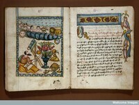 The main text in this manuscript is a work concerning the heavenly movements composed by the 13th-century Armenian philpsopher Hovhannes Erznkac'i. The illuminated page shows an astronomer gazing through a telescope. The sun and moon can be seen just below a band of cloud
