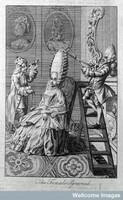 A woman having her extremely high wig (which towers over her head in an oval form and is flanked by parallel horizontal curls) dressed with curling tongs by a French hair-dresser on a step-ladder; the woman's husband looks on through a small telescope.