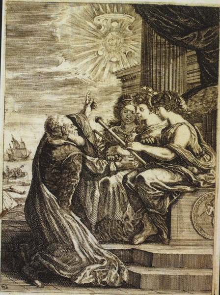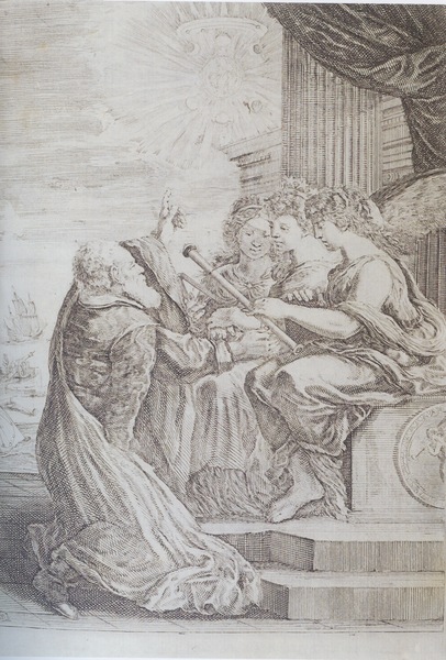 Image of Galileo handing a telescope to three muses (young women in classical garb), while gesturing upward toward representation of his observations in the sky.