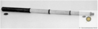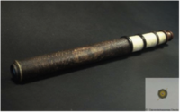 Objective lens (f = 492mm) and three lens erecting eyepiece of the type indicated by Huygens and Campani (three equal lenses). Cardboard tube consists of four parts, lens portion covered with a brown-colored textured paper. On brown dye are still-distinguishable characters, other three parts are coated with a smooth, almost parchment-like paper. Edges of horn rings fitted, also the lens is mounted in horn. The eyepiece consists of an inner and an outer tube. The outer tube is wooden mount with eyecup. In the inner tube are three equal lenses encased in wood rings. On the tube is indicated with ink the correct position, this appears to be true. Directly behind the objective lens (ø22.5mm) is an aperture of ø12.5mm.