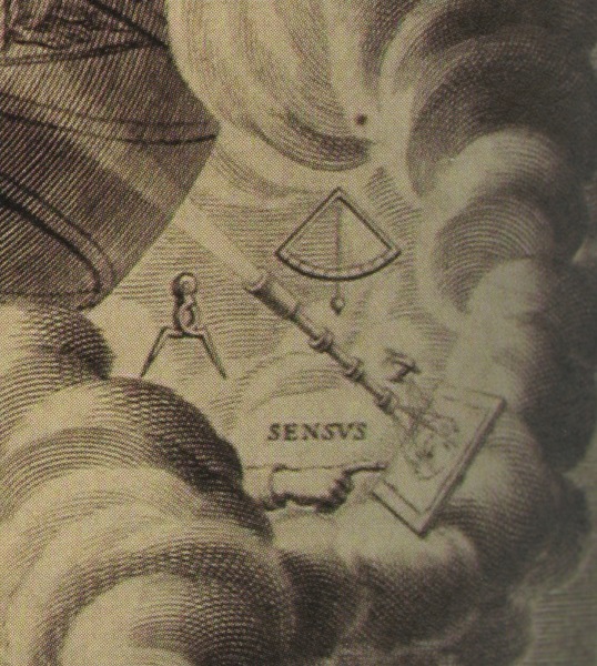 Light of the Sun (knowledge or truth?) passes through a refracting telescope (labeled, with other instruments, Sensus) to project an image.