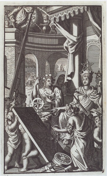 Very similar to frontispieces of Ozanam and Prestet. In the background a figure peers through a large refracting telescope toward a shooting star.