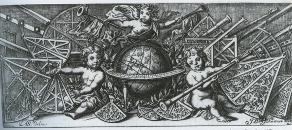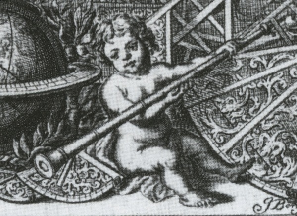 After a design by Andreas Stech. Illustration of scientific instruments and putti on dedication page to Louis XIV. Putta on the right holds a large (trumpet-shaped?) refracting telescope.