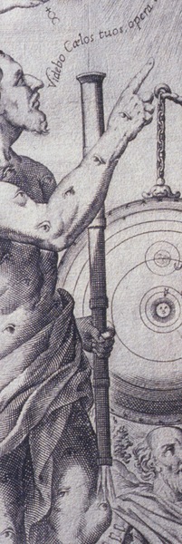 Figure on the left (embodying knowledge?) gestures upward with his right hand. The other hand grips a large refracting telescope through which the rays of the sun are passing.