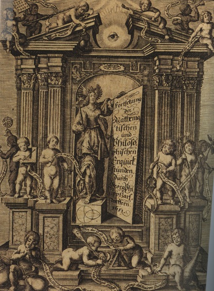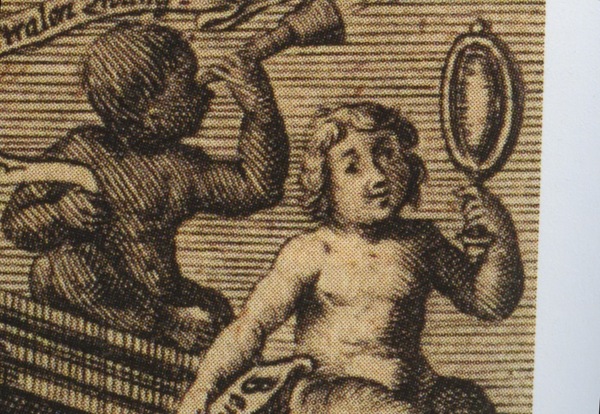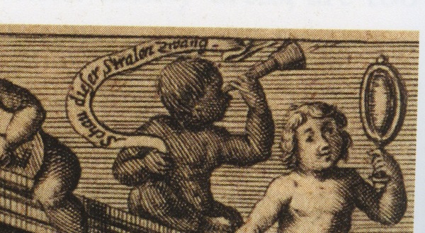 Putta in upper left of image looks through a refracting telescope. Figure's caption is Schau dieser Stralen Zwang.