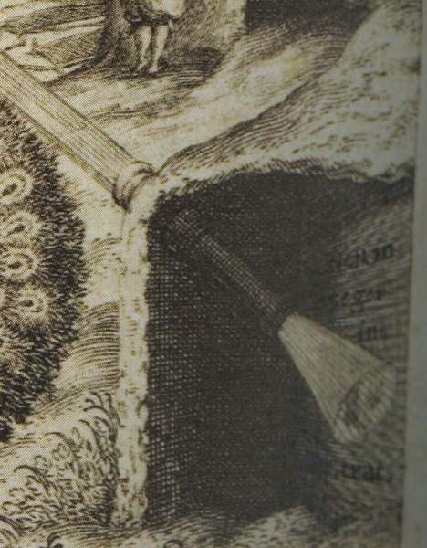 Light from the Comprimor exoriens hidden behind a mountain labeled absq oculo passes through a refracting telescope mounted in the wall of a cave to project an image (of the moon?) on the wall. The beams of light are labelled Mox vt superauero rupes, and the image in the cave is labeled Nenio[?] teger in trat.