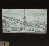 This highly symbolic engraving (one can notice the absence of a mast for the pulley) was possibly printed for the first time in Gottigniez's book "Logistica Universalis", Naples 1687. IHS is a Christologic symbol ("In Hoc Signo vinces", or "Iesus Hominum Salvator") much used by the jesuits. Gottignies was indeed a Jesuit. The engraving was reprinted by F.Bianchini in his "Hesperi et Phosphori Nova Phaenomena", Rome 1728, which is much better known and possibly the source for the slide.