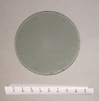 Convergent gray-green lens, biconvex or plano-convex with large radius of curvature. Diameter is 77 mm and thickness 5 mm.Two inscriptions on both sides of its surface, along the rim. Objective lens of a long refracting telescope or an aerial telescope. According to the inscription, manufactured in Genoa in 1716 and offered by instrument maker Antonio Degola to the astronomer, antiquarian and leading member of the papal court Francesco Bianchini (1662- 1729). Apparently, reference to Clement XII is a mistake, since the Pope in 1716 was Clement XI. Focal length measured at 13450 mm.