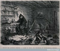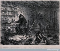 A man is sitting at a desk in a room crowded with books, papers, a telescope and a globe, he is writing as he watches three small children fighting on the floor. Wood engraving. 13.3 x 16.5 cm.