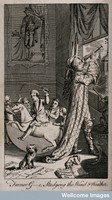 A man is looking out of the window through a telescope as young children play on a rocking horse. 15.5 x 9.2 cm.