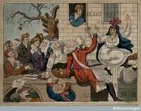 The Prince of Wales looks from a window of Carlton House at a crowd of people and a woman on a broomstick; George III looks on through a telescope. Coloured etching by "H. Shade" after "Nicholas Lunatic". The woman on the broomstick may be Caroline of Brunswick, Princess of Wales. Below her, the gate of Carlton House is labelled "Fat witch of London". The man in the left foreground is Samuel Whitbread. Seated in the centre is Sheridan with a bottle of sherry. A paper inscribed "Catholic bill" is on the left