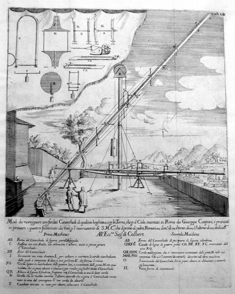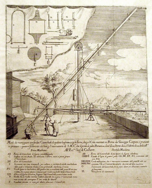 Illustration of an observer looking through a very long refracting telescope supported by a mast. A second horizontal telescope rests behind it.