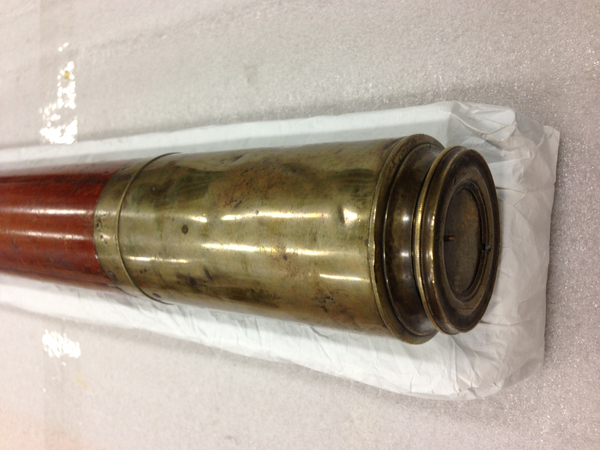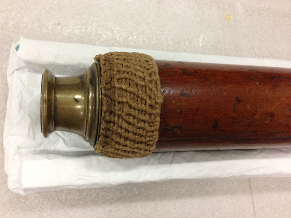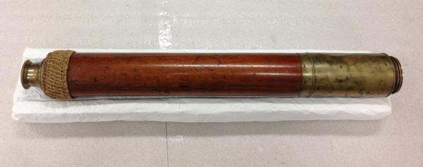 Tubular wooden telescope with brass eyepiece and knotted jute covering, brass extending lens holder and a brass screw-on lens cap; note that the inner lens has crack across diameter of lens.