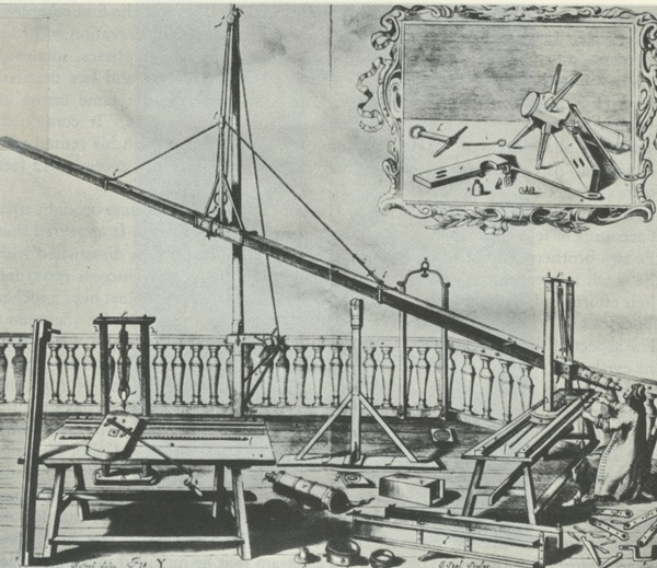 Hevelius looks through the eyepiece of one of his large rooftop refracting scopes, suspended on mast.