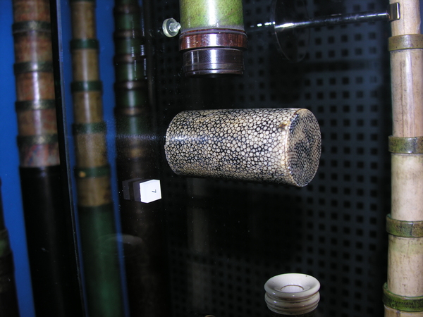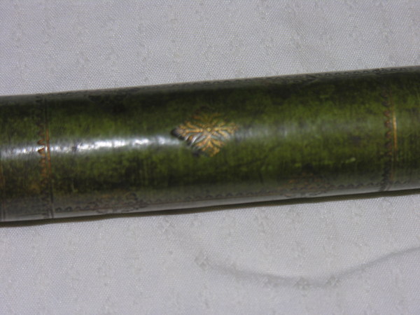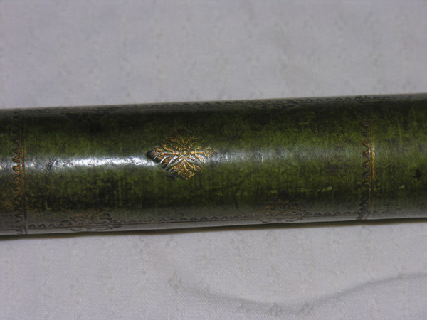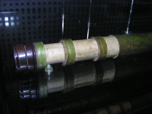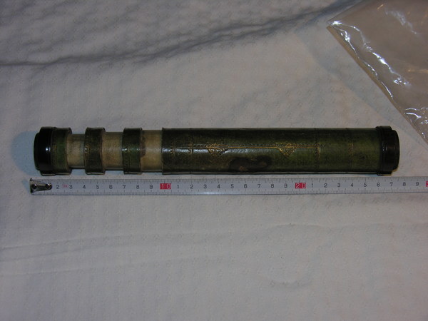 "English telescope with tubes made of pasteboard. The main tube and the ferrules are covered with green parchment, with simple gold tooling. The stamp used resembles Turner (1966), no. 27. Three drawtubes covered with white vellum. The end pieces are made of lignum vitae or pock wood. The eye lens is not original. Length 23-60 cm, Ø 3.5 cm. Unsigned, but convincingly identified as manufactured in England. According to Rudd (2005) this instrument is one of the oldest preserved English telescopes, dating from the third quarter of the seventeenth century.