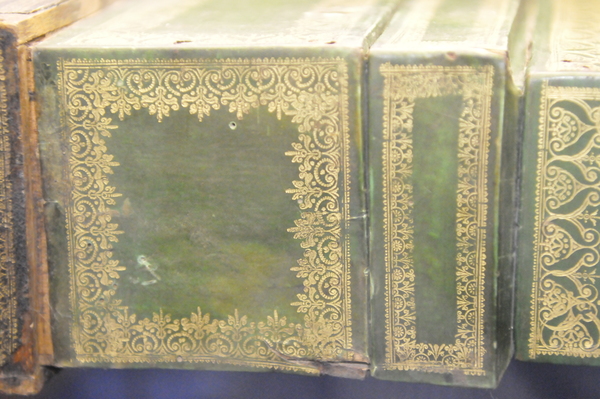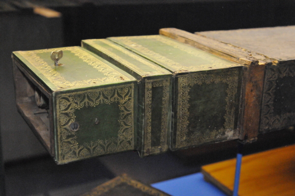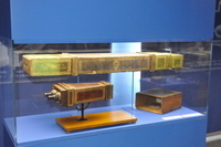 Early case binocular telescope after the design of Cherubin d'Orleans. By Father Apian, Capuchin monk. Dimension of main box containing ocular lenses are 97 mm x 202 mm, length 880 mm. Main box bears coat of arms of Baron von Burlow-- a grapevine with fourteen grapes surrounded by laurel wreath. Indicates it likely belonged to the collection of Hanover Privy Councillor and Grand Reeve Joachim Heinrich Freiherr von Burlow (1650–1724). Was likely bequeathed to the University of Gottingen, and from there turned over to the Jena collection in 1926. (Remaining Apian binocular in Gottingen collection very similar to this one and probably from same source.)