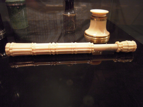 According to Stuart Talbot (2008) the shape, length and optics of this telescope indicates a very early date. The construction resembles the narrow slightly conical telescope in the 1614-portrait of Simon Marius. Such ivory telescopes were made for the seventeenth century cabinets of curiosities. It is remarkable that the turning tables which were used for the turning of ivory resemble the mechanical machines that were developed in the seventeenth century for the grinding of telescope lenses. It probably was no coincidence that the English ‘ivory turner’ Richard Reeve(s) developed himself into one of the first optical instrument makers in England. In the Netherlands, in the 1630s, Descartes and Constantijn Huygens Senior also ordered telescope lenses at an unnamed "Tourneur d’Amsterdam"" (Louwman, and Zuidervaart, 2013. p.36).