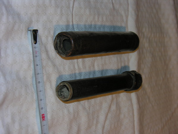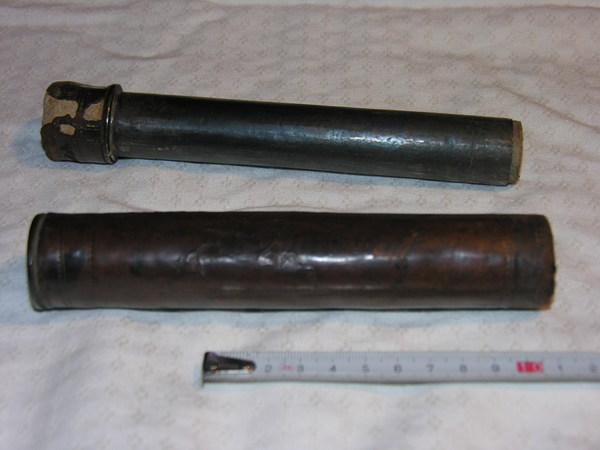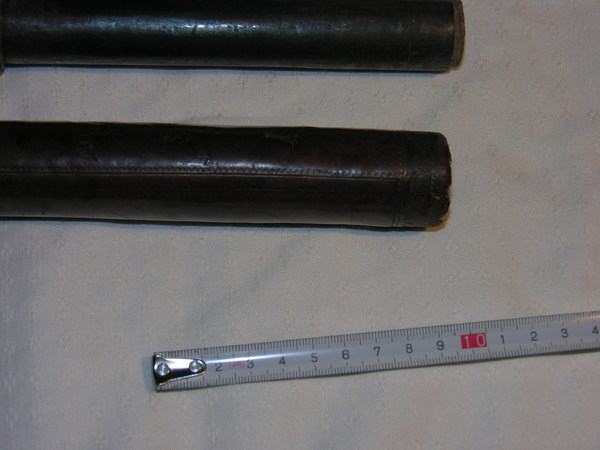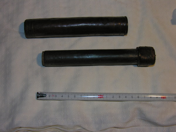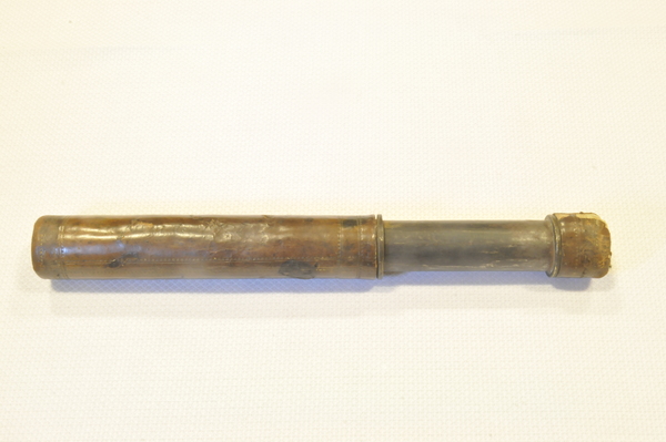 Tubes made of thick metal and outer tube covered in old brown calf leather, inner tube has brown paper. Both tubes of tin. Objective is replaced, it has the wrong focal length and is very fuzzy. Eyepiece is plano concave. It is not confirmed but it is suspected that it is from Belgium or Germany, earlier from weapons dealer. Very old-- could be pre-1620.