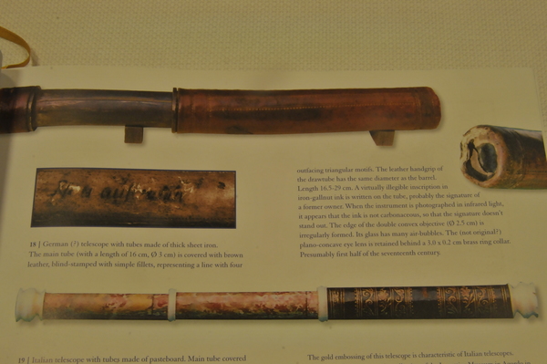 The main tube (with a length of 16 cm, Ø 3 cm) is covered with brown leather, blind-stamped with simple fillets, representing a line with four outfacing triangular motifs. The leather handgrip of the drawtube has the same diameter as the barrel. Length 16.5-29 cm. A virtually illegible inscription in iron-gallnut ink is written on the tube, probably the signature of a former owner. When the instrument is photographed in infrared light, it appears that the ink is not carbonaceous, so that the signature doesn’t stand out. The edge of the double convex objective (Ø 2.5 cm) is irregularly formed. Its glass has many air-bubbles. The (not original?) plano-concave eye lens is retained behind a 3.0 x 0.2 cm brass ring collar. Presumably first half of the seventeenth century" (Louwman and Zuidervaart, 2013).