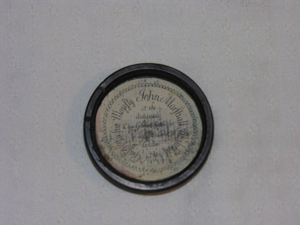 John Marshall had an optical workshop in Ludgate Street, London between 1685 and 1723. He was an apprentice of Jack Dunning (also called John Dunnett), who was a subcontractor of telescope tubes in the second quarter of the seventeenth century . It is suggested therefore that Marshall made his own telescope and microscope tubes" (Louwman, and Zuidervaart, 2013).
