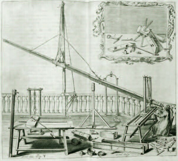 This illustration is of a "large telescope with a wooden tube hanging on a hoist" (Louwman, and Zuidervaart; p. 51).