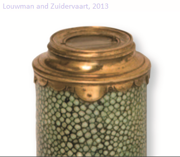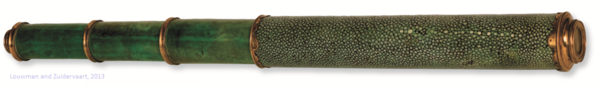 "Main tube and three drawtubes covered with green coloured ray skin. Brass curved fittings and protective lids. Unsigned, but resembling the preceding Martin (LC 51) and next Dollond manufactured (LC 54) telescopes. Third quarter of the eighteenth century" (Louwman and Zuidervaart, 2013).