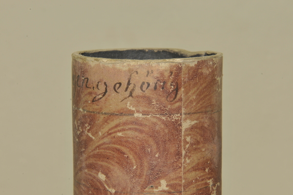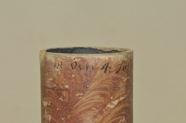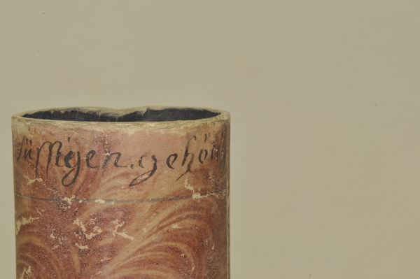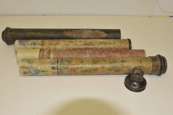 Presumably Italian or German telescope from the late 17th century. Incomplete telescope with two draws and eyepiece insert present, but the objective lens is missing. The edge of the eyepiece unit is inscribed "fuer den 4 fuessigen".