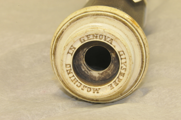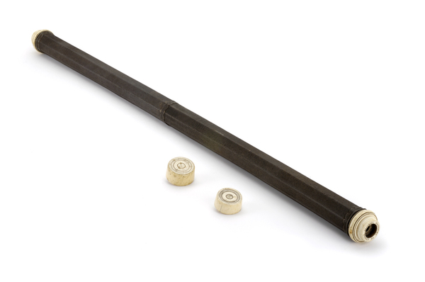"The octagonal barrel of this non-achromatic telescope is quite typical of telescopes of this relatively early date. It is covered with black sharkskin. Both the eyepiece and objective lenses are set in ivory mounts and have ivory screw-on caps. There is a single draw tube covered in green leather with a small amount of gold-tooled decoration. The draw tube also has three stop lines, each made up of rings of gold-tooled circles. The maker's name is inscribed on the ivory fitting for the objective lens" (Royal Museums Greenwich). Greenwich website suggests H. Huguenin as a maker and suggests year made as circa 1670.
