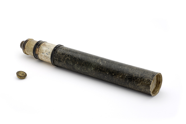 "The barrel of this hand-held telescope is made of paper in imitation of sharkskin, while the three draw tubes are made of paper. The fittings are of horn and brass, including a brass eyepiece cap, which is possibly of later date. The objective lens assembly is missing. Black stop lines on the draw tubes indicate the telescope's optimum working length" (Royal Museums Greenwich).