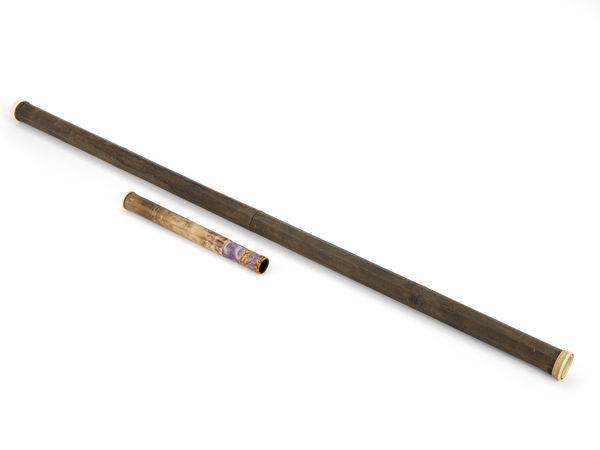 "This non-achromatic telescope has an octagonal barrel covered in rayskin. The barrel unscrews into two sections. There is a single draw tube made of vellum, which has stop lines drawn onto it to indicate the different working lengths of the telescope according to the distance of the object being viewed. There is also some tooled decoration on the draw tube. The other fittings are of ivory, although parts of the eyepiece assembly are missing. The objective lens is a modern replacement. The telescope is thought to have belonged to Admiral Augustus Keppel (1725-86)" (Royal Museums Greenwich).