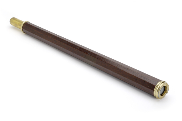 "The decagonal barrel of this non-achromatic telescope is made of mahogany and is tapered. It has a single brass draw tube and brass fittings, including a sliding objective lens cover, of which the slide is missing. The eyepiece is also missing" (Royal Museums Greenwich).