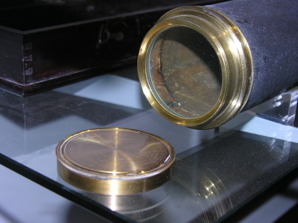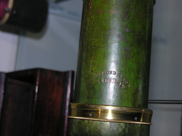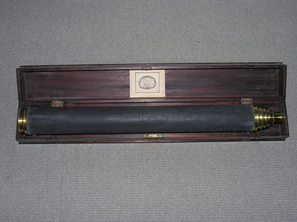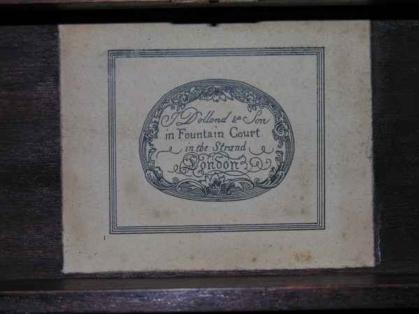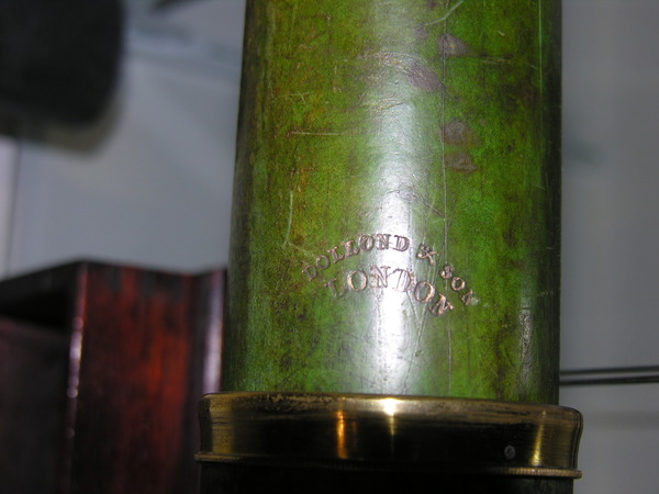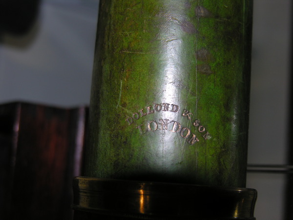 Dollond stops using flint forward in 1759. Dating is secure from purchase by Royal Observatory in Stockholm. Bengt Ferner traveled to London to see Dollond summer 1759 and ordered several telescope, which were already crown forward. (Royal Observatory has largest Dollond doublet-- 4 inches, with two square wooden tubes, objective has yellowish Venetian crown glass). Black sharkskin is earliest known Dollond and Son. Trade card in box says J Dollond and Son. Telescope is crown forward doublet, thus after 1759. J Dollond dies November 1761, so dating secure at 1759-61. The five lens eyepiece is in brass, main tube is wood, and telescope is in its original box.