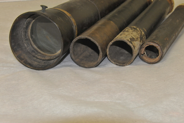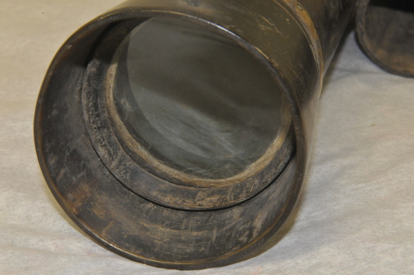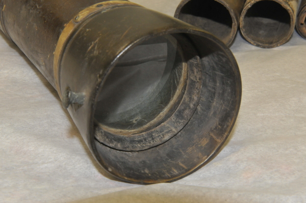 Main tube of wood. Draws 1 and 2 pasteboard. Draw 3 sheet metal. No clear extension marks. Eyepiece lenses now off-axis, but rough image is visible with objective focal length 610 mm and effective eyepiece at 80 for magnification of ca. 8x. Last (eyeside) third of main tube has an inner tube, which decreases the inner diameter of the main tube to meet the outer diameter of Draw 1. (Potential explanation: This functions as a stop on the objective - nearly half (in diameter) of a light beam incident on the objective is blocked by this lip and does not pass into Draw 1.) Inside tube begins at ca. 190 mm away from light source of the 610 mm focal length. Opening of this inner tube: 41 mm at eyeside vs. 47 mm at objective aperture. Metal tube of innermost tube brings to mind the metal tube telescopes at Skokloster and in Kassel, which likely date from the 1660s and 1670s.