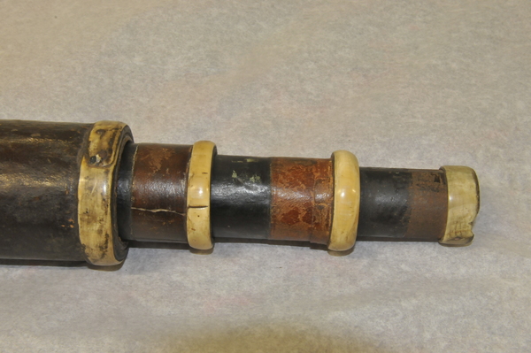 "This crudely made non-achromatic telescope has three draw tubes. The barrel and two of the draw tubes are made of leather, while the smallest draw tube is made of iron. The other fittings are of leather and horn and include a tapering sun shade fixed to the end of the barrel. The eyepiece has a metal cap. This is believed to be an early example, although the lenses are quite large for a 17th century telescope" (Royal Museums Greenwich).