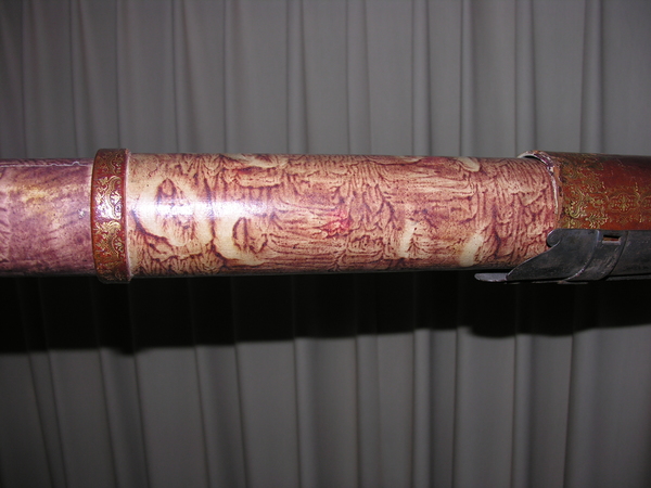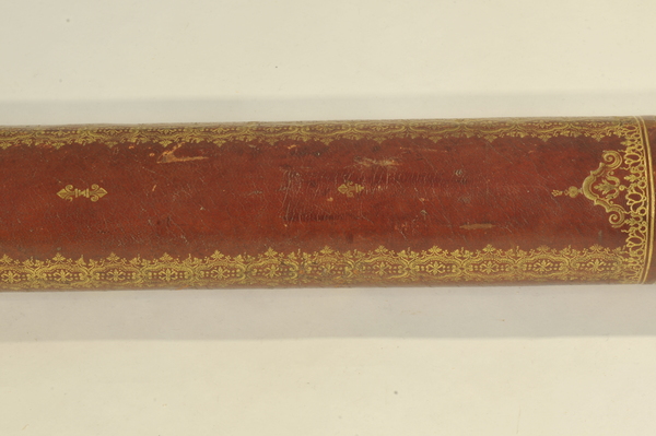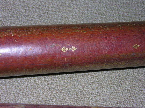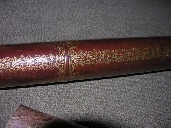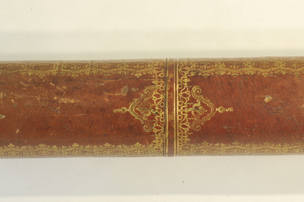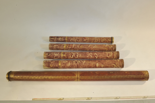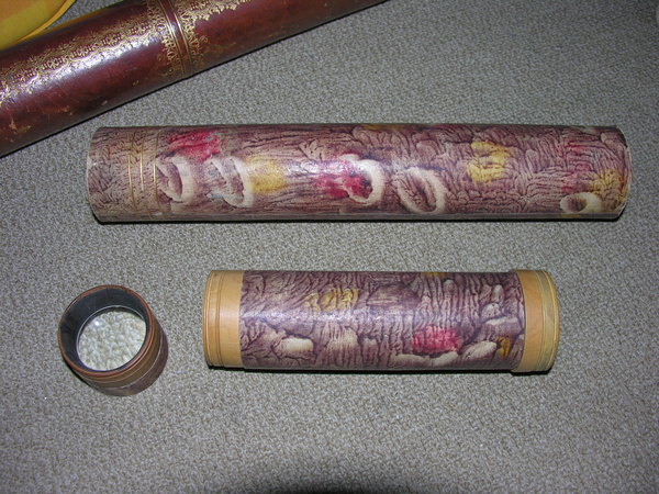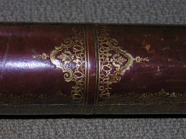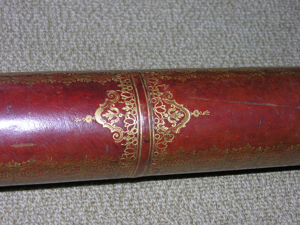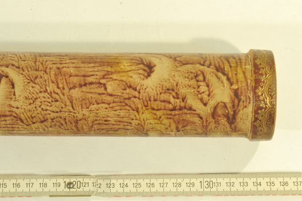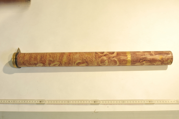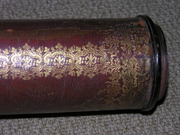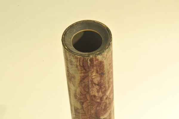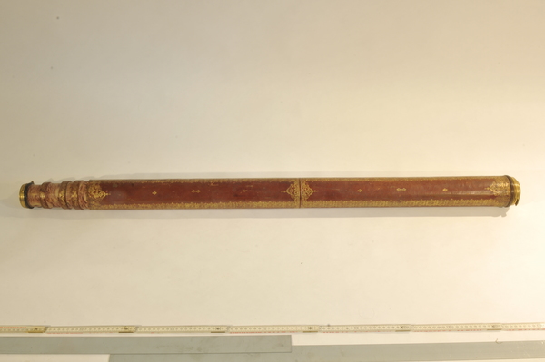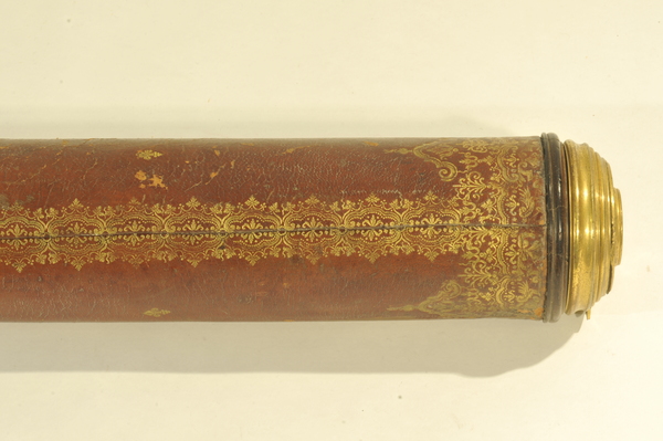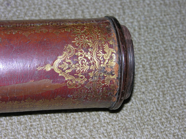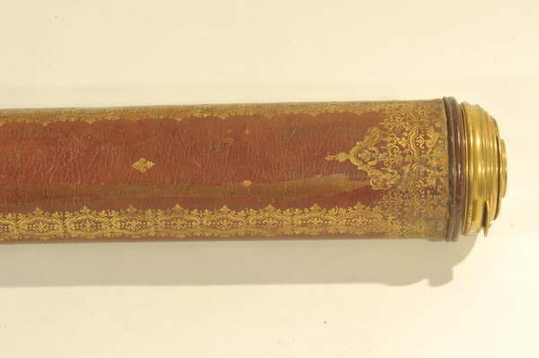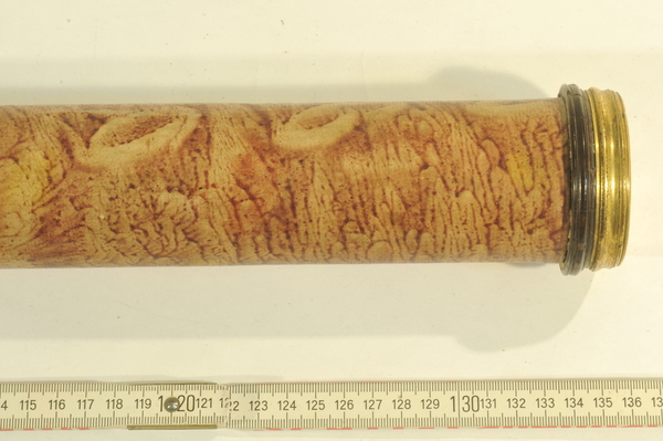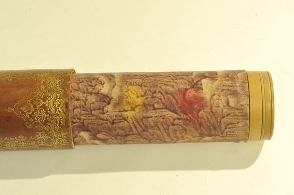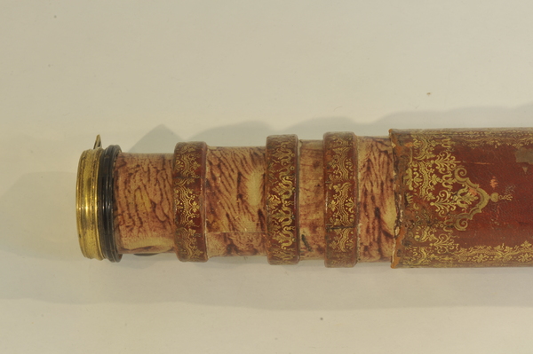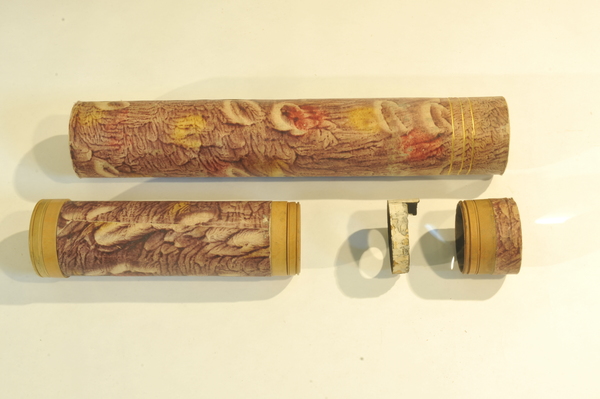 Only known 4 lens reverse taper. Wallpaper kliester indicates French or Italian origin. Unusual in that most reverse tapers are English. Point of reverse taper is that large eye lens gives large field of view. Possible maker Cherubin d'Orleans but no evidence. Tooling is unique, nothing similar has yet been found. Early Campani is combed marble. Later have some wallpaper marbling. De Rheita establishes the idea of a reverse taper, but d'Orlean makes it better known. De Rheita also proposes the idea of using two eye lenses in order to increase the field of view. De Rheita specialized in binoculars, and d'Orleans, Patroni, and Bailloui make them on the same principle. Large end at the eye, just like a reverse taper. Ends of tube are worn. Proportions in keeping with "La dioptrique oculaire" by Chérubin d'Orléans, père, 1671. Four eyepiece, chromatic compensation (by chance). Erector and field lenses all placed in tube in last 400 mm of main tube (see schematic in RW 1996 Annals of Science Paper).