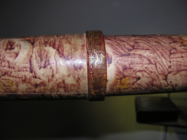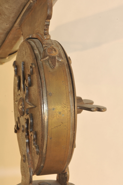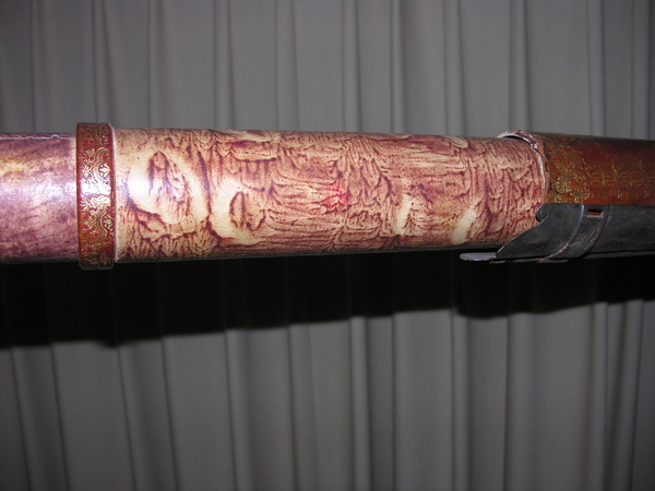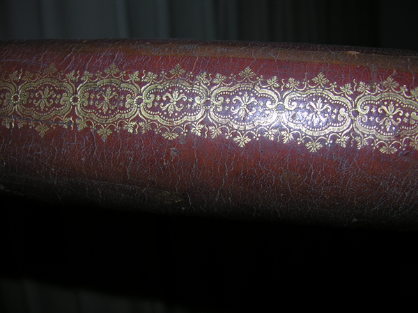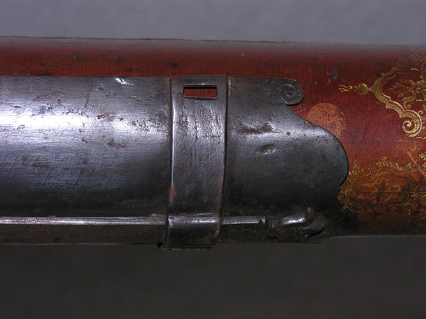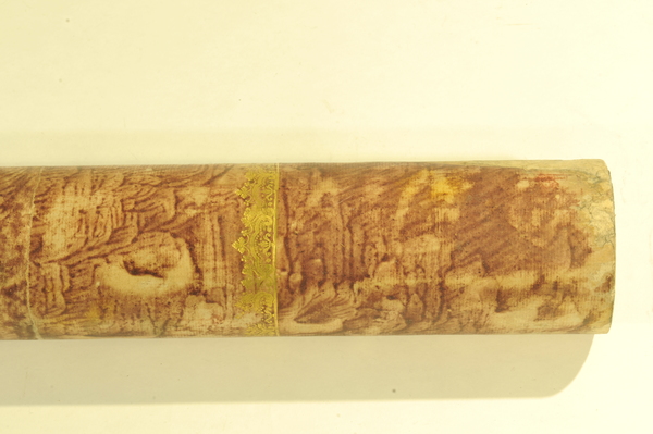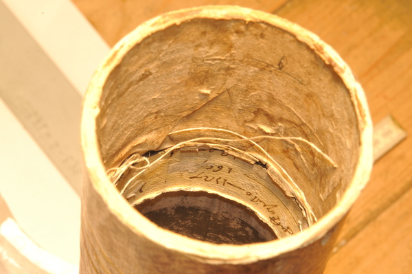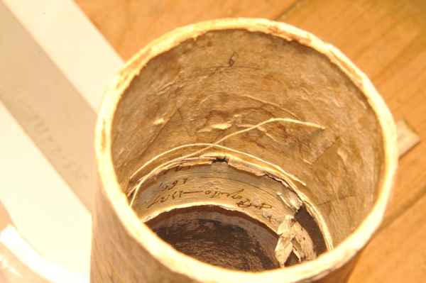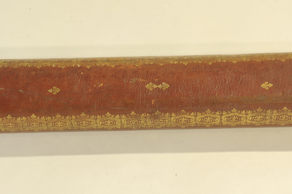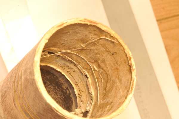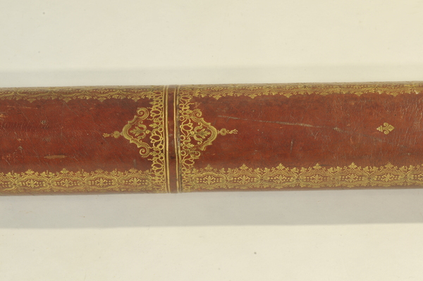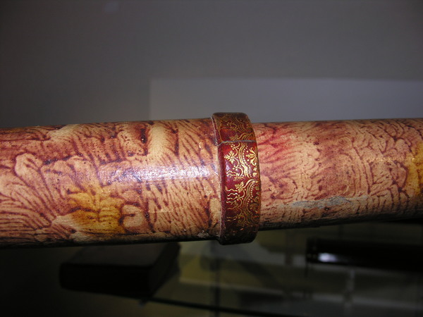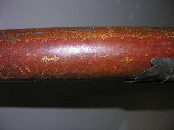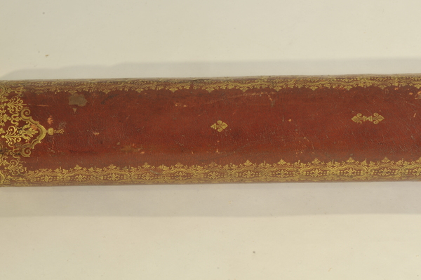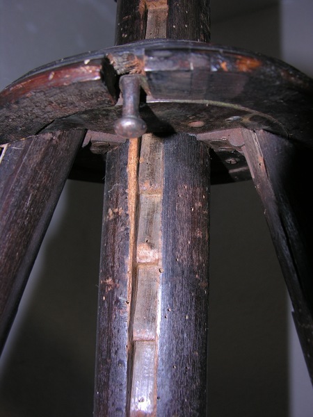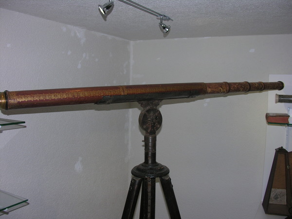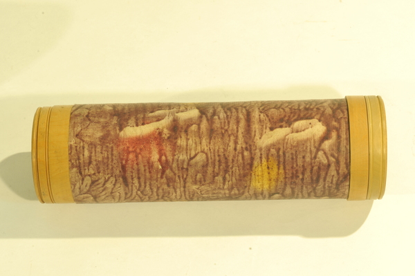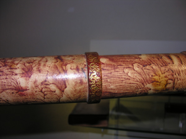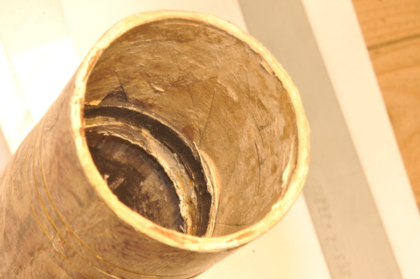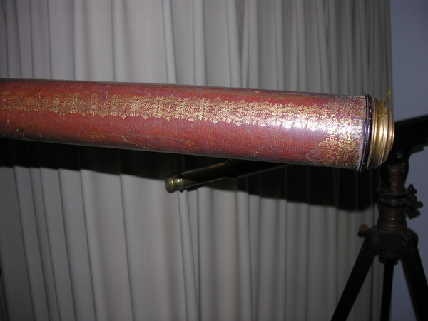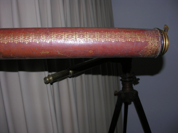 Only known 4 lens reverse taper. Wallpaper kliester indicates French or Italian origin. Unusual in that most reverse tapers are English. Point of reverse taper is that large eye lens gives large field of view. Possible maker Cherubin d'Orleans but no evidence. Tooling is unique, nothing similar has yet been found. Early Campani is combed marble. Later have some wallpaper marbling. De Rheita establishes the idea of a reverse taper, but d'Orlean makes it better known. De Rheita also proposes the idea of using two eye lenses in order to increase the field of view. De Rheita specialized in binoculars, and d'Orleans, Patroni, and Bailloui make them on the same principle. Large end at the eye, just like a reverse taper. Ends of tube are worn. Proportions in keeping with "La dioptrique oculaire" by Chérubin d'Orléans, père, 1671. Four eyepiece, chromatic compensation (by chance). Erector and field lenses all placed in tube in last 400 mm of main tube (see schematic in RW 1996 Annals of Science Paper).