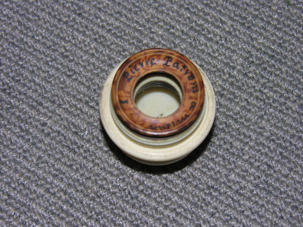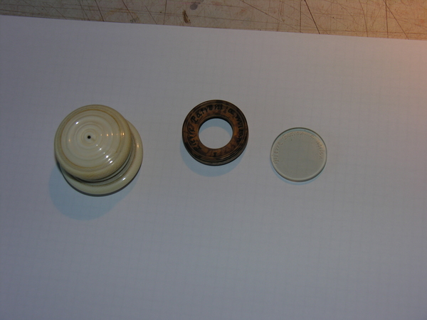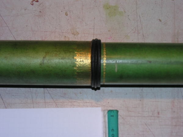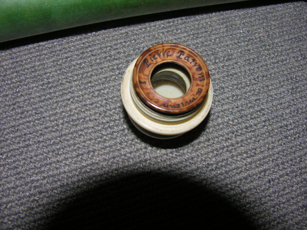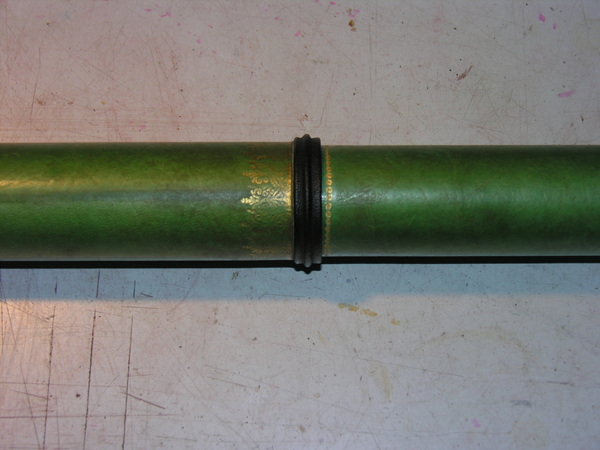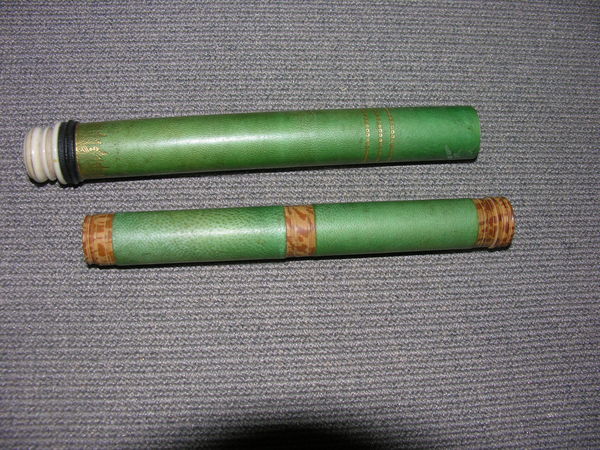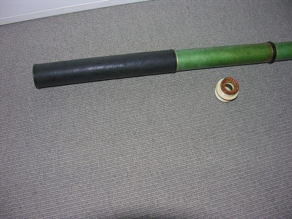 Wood tubes rather than paper. Has a leather case (current condition: sticky with holes). Green leather tubes, with rayskin on main tube, and ivory end caps. Two nearly identical signatures, one on the objective lens and one on the objective cell.