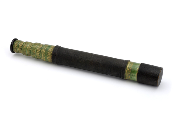 "This non-achromatic telescope has a black sharkskin barrel. The three vellum draw tubes are decorated with gold-tooled motifs and have stop lines drawn onto them to indicate the optimum working length of the telescope. The objective lens cap is also made of sharkskin, but the eyepiece cap is missing. The lenses are set in turned ebony mounts. An inscription on the smallest draw tube, 'VES / DY / A. LOBSERVATOIRE.', refers either to a maker or an owner of the telescope" (Royal Museums Greenwich).
