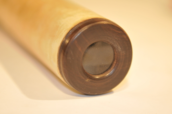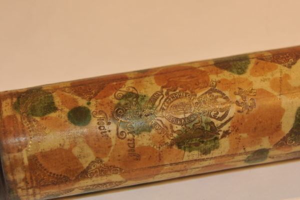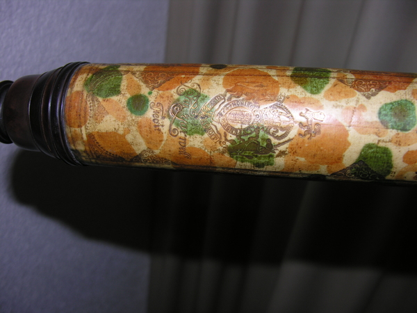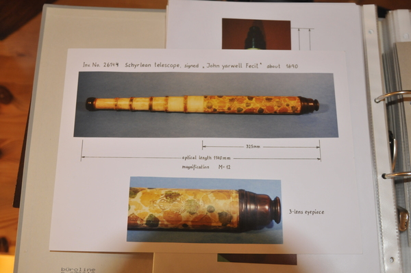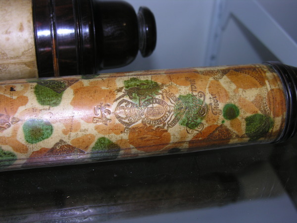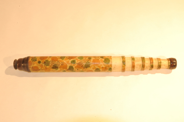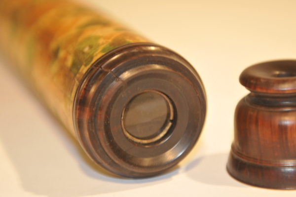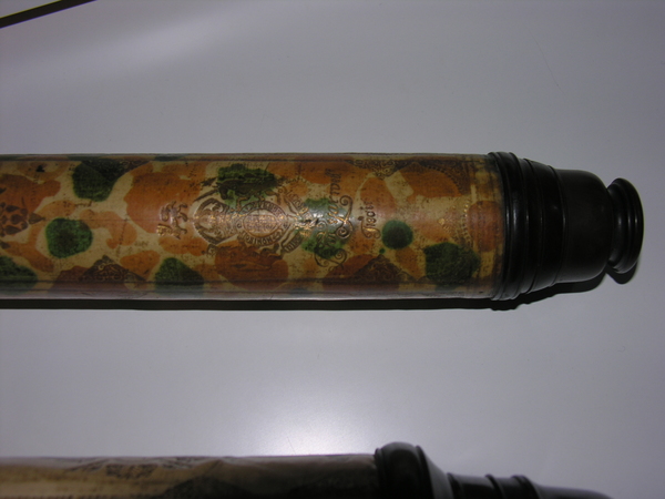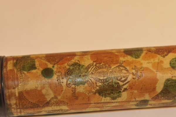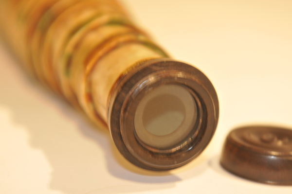 Dates around the end of 17 century. Rare reverse taper, three lens eyepiece, decorated with orange mottling. Magnification is 12. Mount is from the same time period. The tripod legs unscrew in the middle.