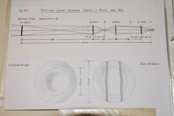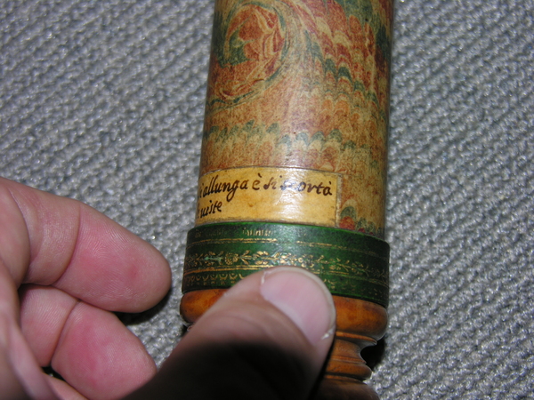 Tubes are wood veneer and green leather decorated with gold circle. Tubes have holes at end for allowing tube to close or open in they are a very tight fit. Objective cell is made of olive wood and has multiple screws. Signature is on the yellowish objective glass. Marble has stick swirling approximately every 6 inches. Almost all Campani scopes have instructions to reverse directions for clearer or bigger, these instructions are on the eyepiece lens system. The eyepiece system in this telescope is a three lens ocular with unequal spacing.