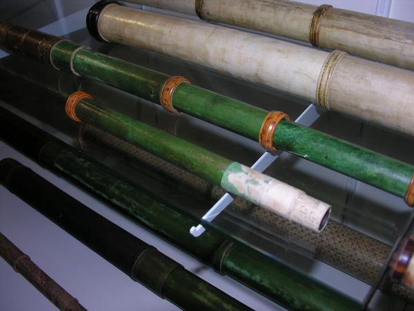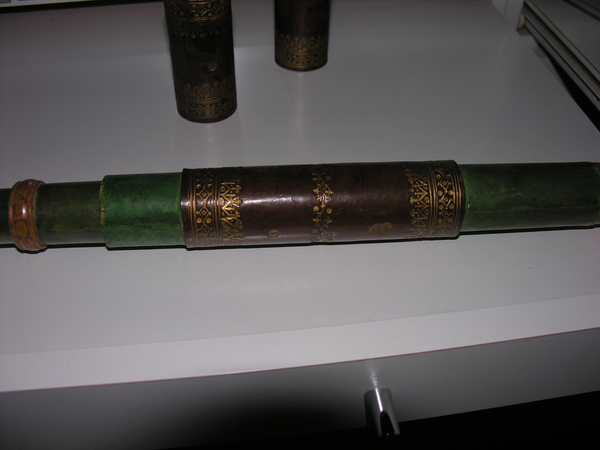 17 century paper green vellum with red/brown middle and caps. Triangle base stick figure typical of 17 century but not found in the 18 century. Olive wood end rings (same size)-- finer mottling than boxwood.