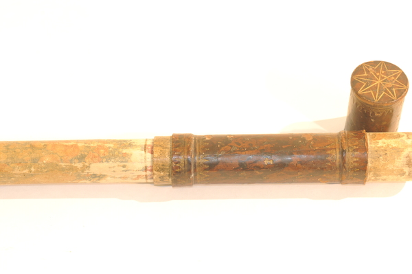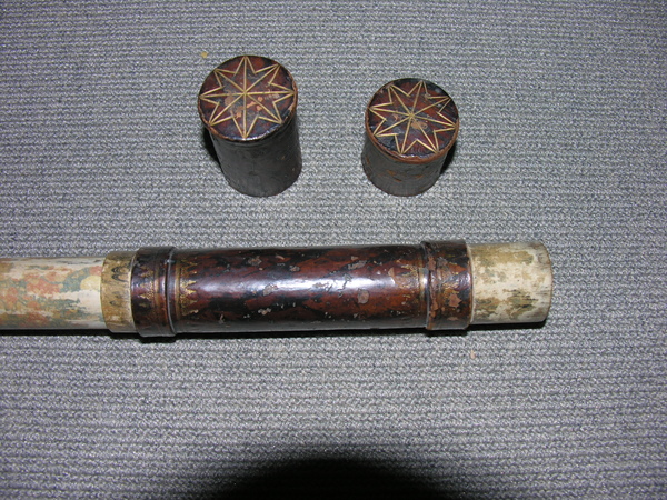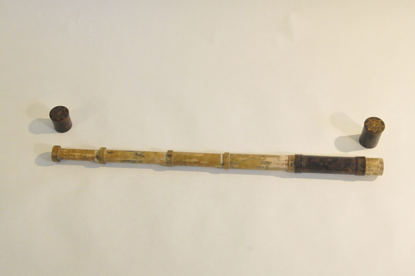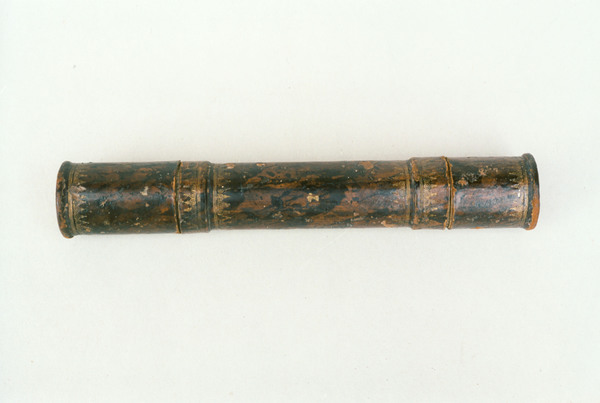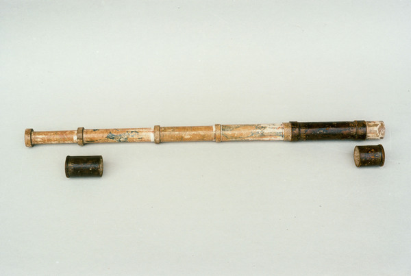 Four cardboard tubes covered in blue and pink marbled paper. When collapsed forms a cylinder enclosed by end caps. Objective of 23 mm stopped down to 19 mm. Very little information known about Dujardin (1594-1645). He was known for sundials. Negative eyepiece. Both lenses held in place with spring. Paper gasket to hold in place. End rings (ferrules) made of wood. Magnification 14x.