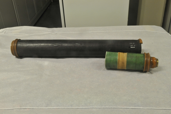 "This non-achromatic telescope has a leather-covered barrel and a single draw tube made of green vellum. The fittings are of boxwood and brass, including a sliding eyepiece cover. The screw-on objective lens cap is now missing. A ring of black dots on the draw tube acts as a stop line, indicating the approximate working length of the telescope. It has a large non-achromatic objective lens to allow as much light as possible to enter the telescope. The telescope doesn’t have extra lenses to correct the inversion of the image, since the more lenses a telescope has, the greater the loss of light. The production of inverted images is typical of night telescopes" (Royal Museums Greenwich).