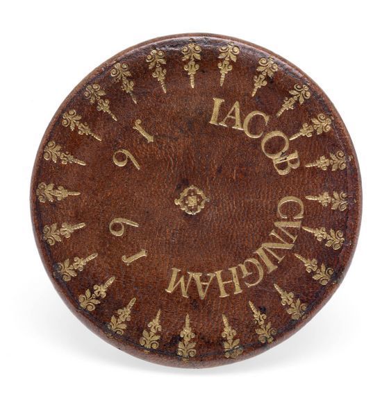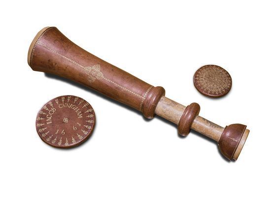 "This Galilean telescope has the name 'IACOB CUNIGHAM' and the date '1661' stamped onto the objective lens cap, making it one of the oldest dated telescopes in Britain. The two draw tubes are made of wood covered in marbled vellum, while the barrel and lens caps are made of wood covered in red leather with gold-tooled decoration. The eyepiece tube also has three gold-tooled stop lines identified by the German words 'NAHE', 'WEITH' and 'OVERSICHTIG'. These indicate different focusing lengths and suggest that the telescope was probably made in Germany. Jacob Cunigham may have been either the maker or the original owner of the telescope. The larger draw tube also has a single gold-tooled stop line. The curious shape of the barrel is designed to accommodate a large objective glass. At this time it was easier to grind a large lens than a small one. Brass diaphragms over the end of each lens have been used to reduce their apertures" (Royal Museums Greenwich).