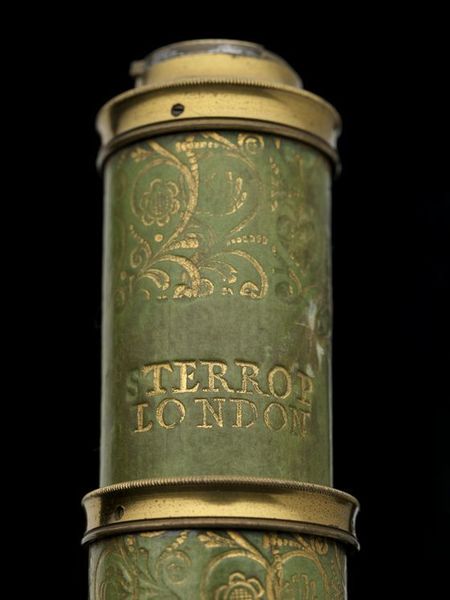 "The barrel of this non-achromatic terrestrial telescope is covered in a dyed rayskin. while the four draw tubes are made of green vellum decorated with gold-tooled motifs. The brass fittings include a sliding eyepiece and objective lens covers. The maker's name appears on the smallest draw tube as 'STERROP LONDON', probably referring to George Sterrop, who worked in St Paul's Churchyard in London in the 1740s. Stop lines, shown as rings of dots drawn onto the draw tubes, indicate the working length of the telescope" (Royal Museums Greenwich).